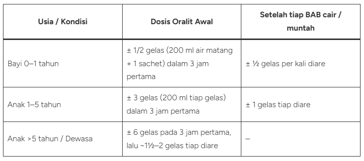 Jika anak atau anggota keluarga mengalami diare, penggunaan oralit dapat membantu menggantikan cairan dan elektrolit yang hilang. Berikut cara dan dosis yang disarankan:
